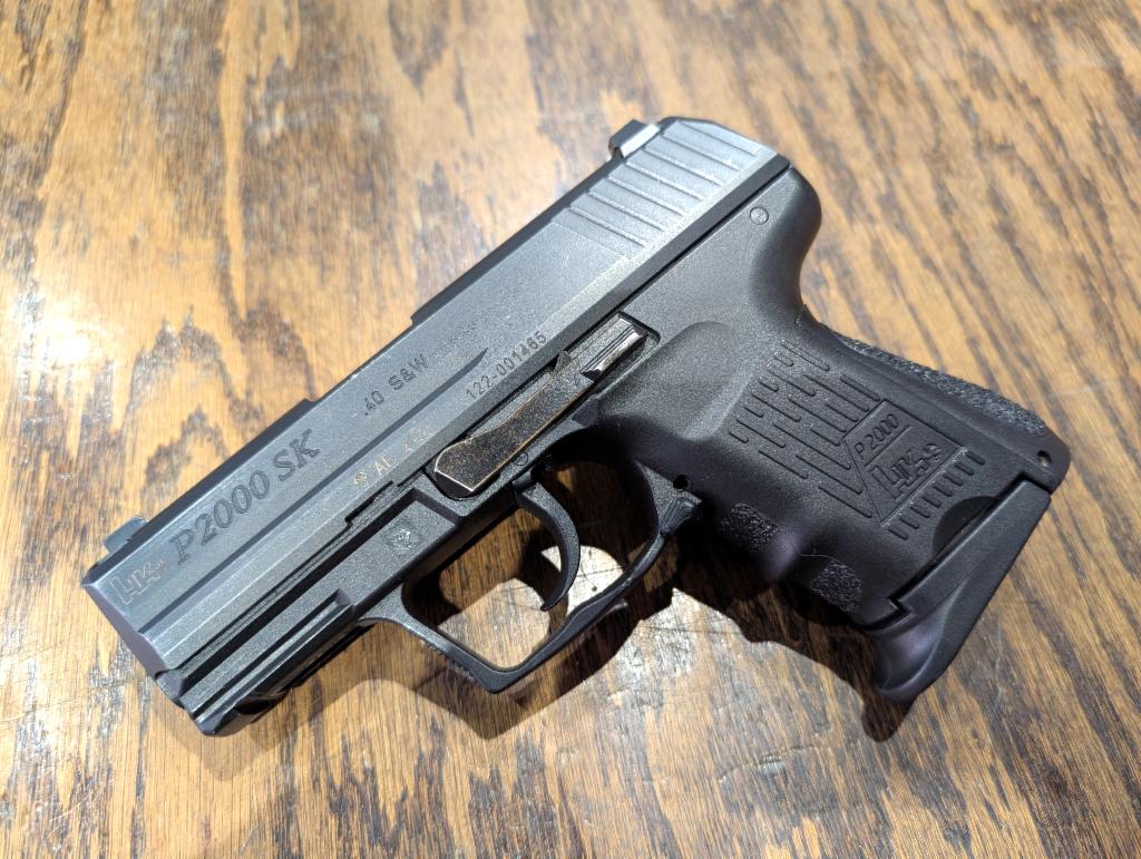 Good condition in original box. 3" barrel, black finish, accessory rail, interchangeable backstraps, night sights. Smallest gun HK made until the CC9 was released in 2024. Comes in original box with kydex holster. AE (2004) date code.