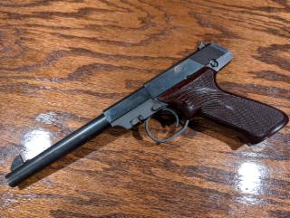 Fair condition rimfire pistol. 6.5" barrel, plastic grips, blued finish, fixed sights, one magazine. Finish is about 80%, with signs of wear and a little bit of surface rust. Grips are in good shape, no cracks or chips.