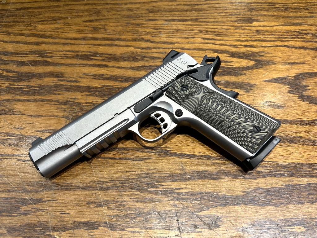 USED in Excellent to as New Condition Tisas 1911 Duty Full Size Steel Frame Semi-Automatic Pistol in 45 Auto with 5" barrel. Stainless Finish, G10 grip panels, Ambidextrous Safety, Rail. Comes with 2-8Rd Mags and Spare Grip Panels (Black)