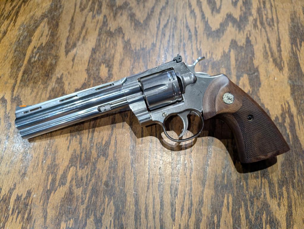 like new in box Colt's Manufacturing, Python, Revolver, Double/Single Action Only, 357 Magnum, 6" Barrel, Steel, Stainless Finish, Walnut Grips, Red Ramp Front/Adjustable Rear Sight, 6 Rounds