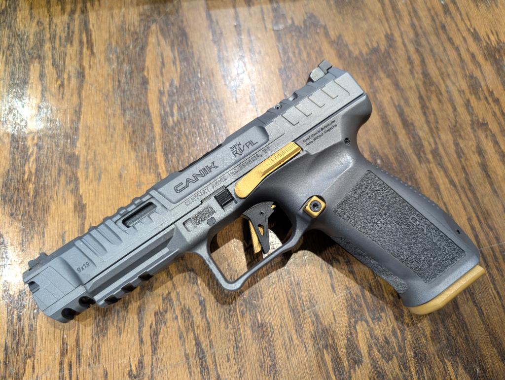 Excellent condition in original box. CANIK, SFX Rival, Striker Fired, Semi-automatic, Polymer Frame Pistol, Full Size, 9MM, 5" Barrel, Gray, Self-Flared Magwell Frame, Fiber Optic Front Sight, Adjustable Rear Sight, 3 Interchangeable Back Straps, 18 Rounds, 2 Magazines, Includes 2 Sided Holster, Magazine Loader, Cleaning Kit, Toolbox and Punch