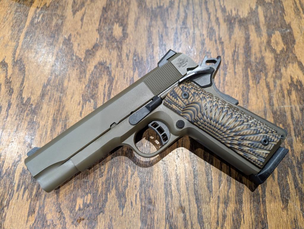 Good condition 1911. Flat dark earth finish, G10 style grips, fixed sights, one magazine.