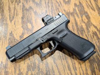 USED in Excellent to As New Condition Glock 47 MOS Full Size Polymer Frame Striker Fired Semi-Automatic Pistol in 9mm with 4.5" barrel. Features Glock Performance Trigger( in Box) and FRT (installed). Comes with Primary Arms SLX RS-10 Red Dot And Suppressor Height Tritium Night Sights. Original Box with Kydex Holster and 3-17RD Mags