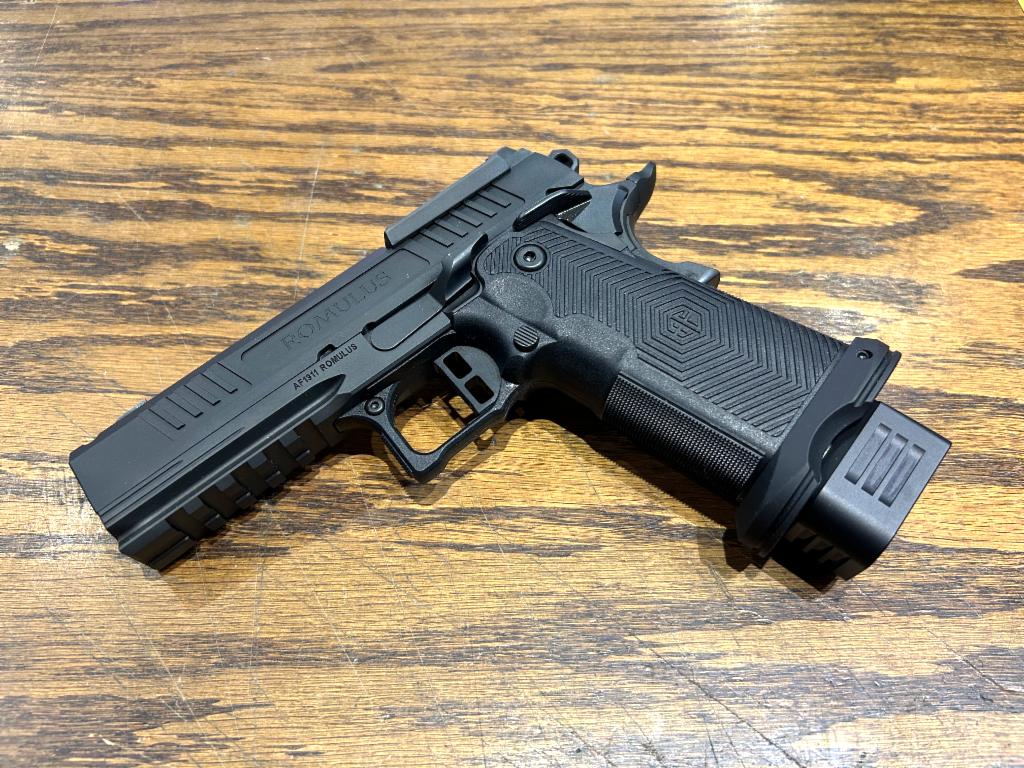 USED in AS NEW Condition Alpha Foxtrot Romulus AF1911 1911/2011 Style Semi-Automatic Pistol in 9mm with 4.1" Barrel. Alloy Frame, Flat face Trigger, Ambi Thumb Safety, Optics Ready. Soft Case with 2 Mags (1-17RD, 1-20RD)