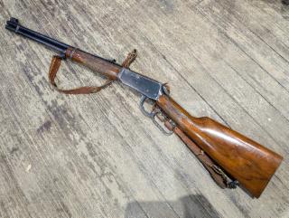 Good condition pre-64 lever action rifle. 1952 production. Blued finish, wood furniture, 20" barrel, sling. Finish shows wear from age and use, but there are no signs of abuse. Finish is 60% or better.