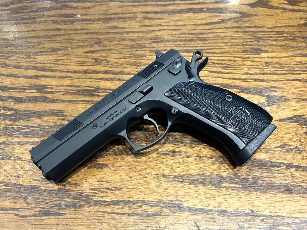 USED in Excellent Condition CZ 97BD Full Size Steel Frame Semi-Automatic DA/SA Pistol in 45ACP with 4.5" Cold Hammer Forged Barrel. Black Finish, Decocker, Aluminum Grips, Fiber Optic Front Sight. Original box with 2-10Rd Mags