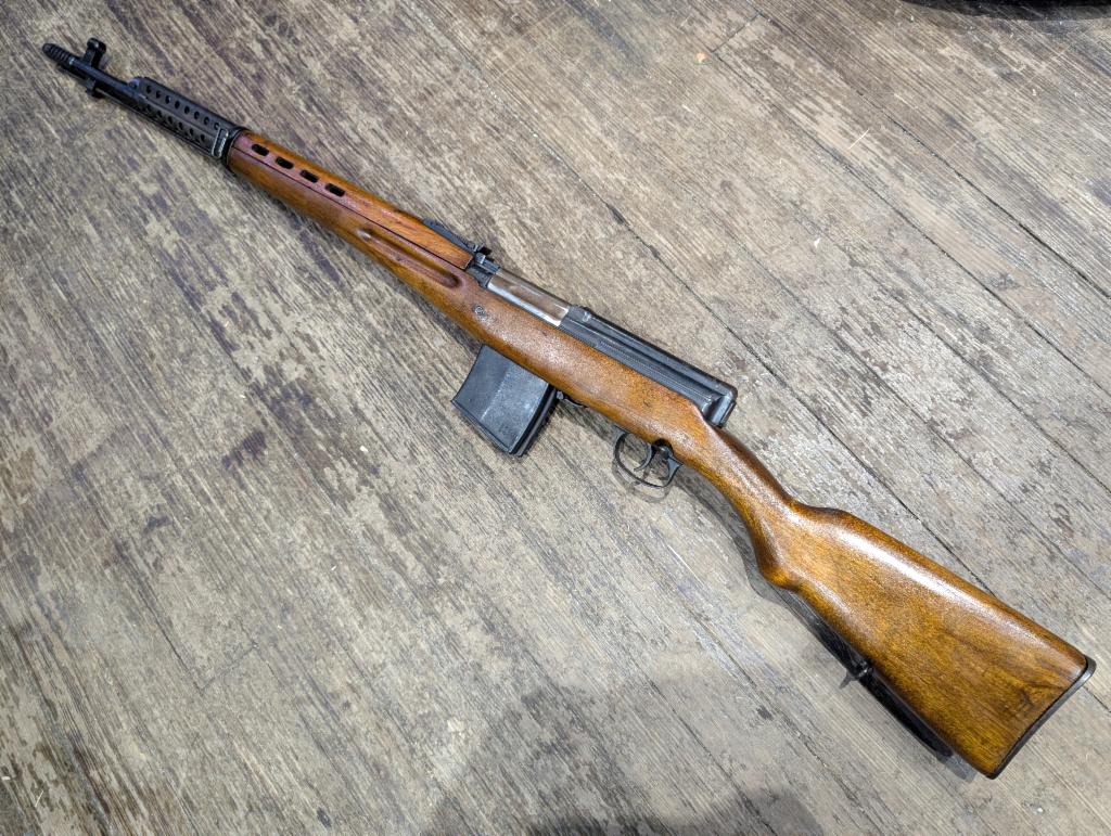Very good condition semi-auto rifle. Star marking indicates Tula factory, April 1941 date code, 24" barrel, wood stock, one magazine, adjustable rear sight, barrel shroud, metal buttplate, cleaning rod. Receiver and trigger guard numbers match, bolt is mismatched. Finish shows wear and patina from age.