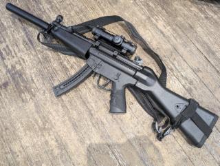 Good condition rimfire MP5 clone. 16" barrel with fake suppressor shroud, sling, Bushnell Trophy optic (tested working), fixed A2 stock, iron sights, four mags, soft case.