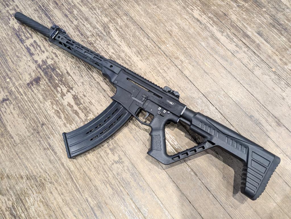 Good condition AR-style 12ga shotgun. Metal receiver, 20" barrel, black finish, synthetic thumbhole stock, iron sights. Includes three mags.