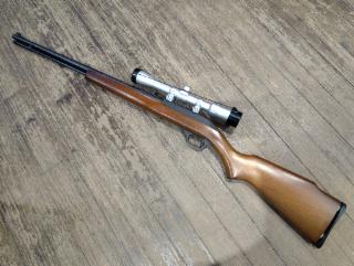Good condition semi-auto tube-fed rimfire rifle. Blued finish, wood stock, Simmons scope, Truglo front fiber optic sight, adjustable rear sight, microgroove barrel. Finish is is good shape with minor blemishes.
