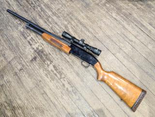 Good condition pump-action slug gun. 24" rifled barrel, Tasco scope, wood furniture. Blued/black finish shows some wear and blemishes from age.