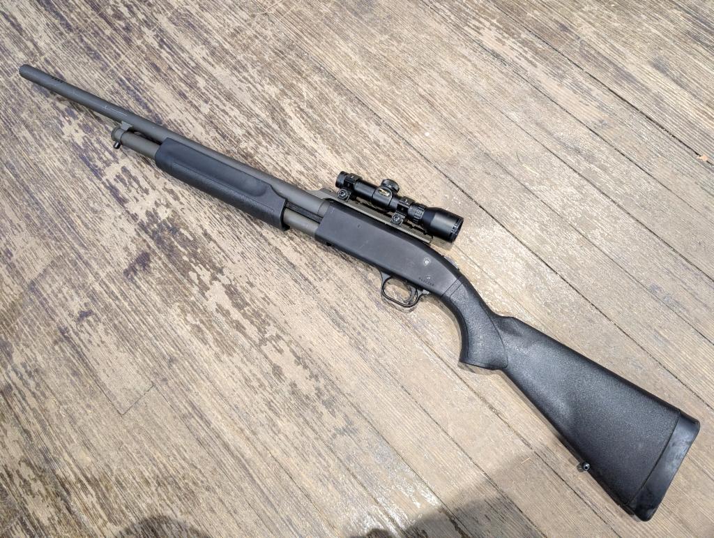 Good condition pump-action slug gun. Black finish, synthetic furniture, BSA Deerhunter optic, 24" rifled ported barrel. Finish shows minor blemishes from use.