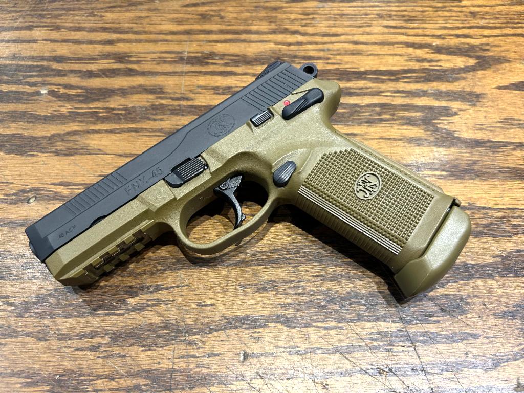 USED in Excellent Condition FNX-45 Full Size Polymer Frame Semi-Automatic Pistol in .45 ACP with 4.5" Barrel. Black Slide, FDE Frame, Ambidextrous Safety/Decocker. Original Box with 3-15RD Mags