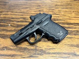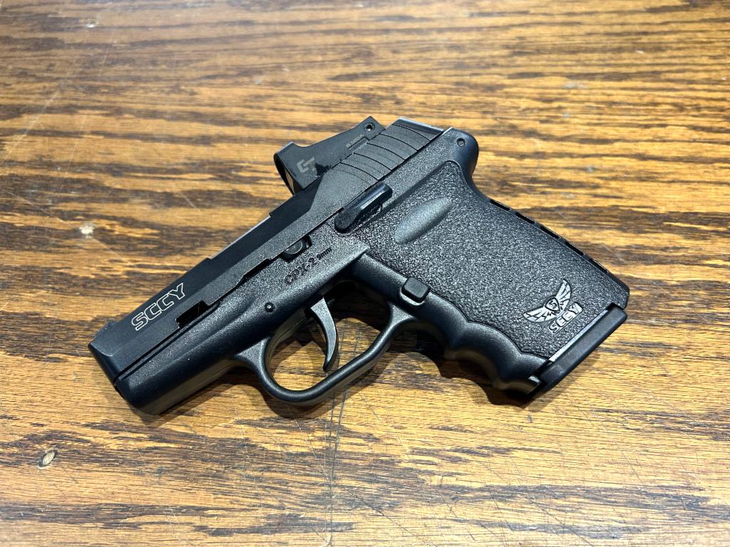 USED in Excellent to As New Condition SCCY CPX-2 Compact Polymer Frame DAO Hammer Fired Semiautomatic Pistol in 9mm with 3.1" Barrel. Black. Comes with Crimson Trace Red Dot. Original box with 3-10Rd Mags