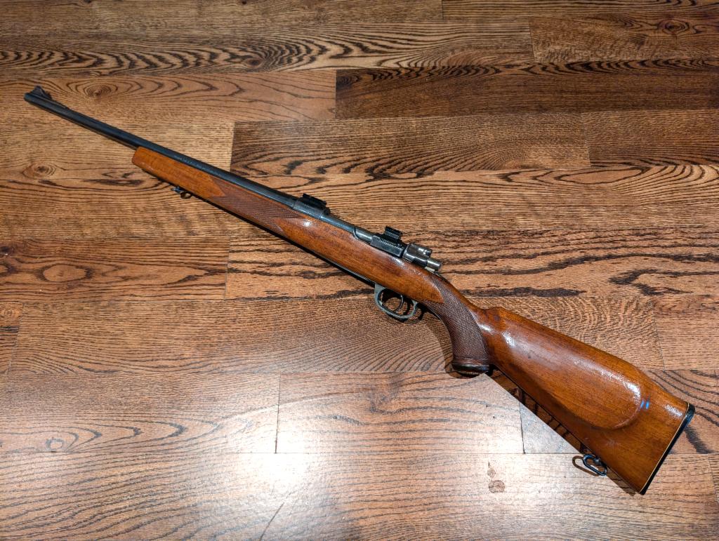 Sporterized Mauser with wood stock in pretty good condition. Features scope mounts, front iron sight, and sling mounts. Bolt handle is ground flat. Penny poorly epoxied into the bottom of the stock. Magazine floor plate is missing a screw.
