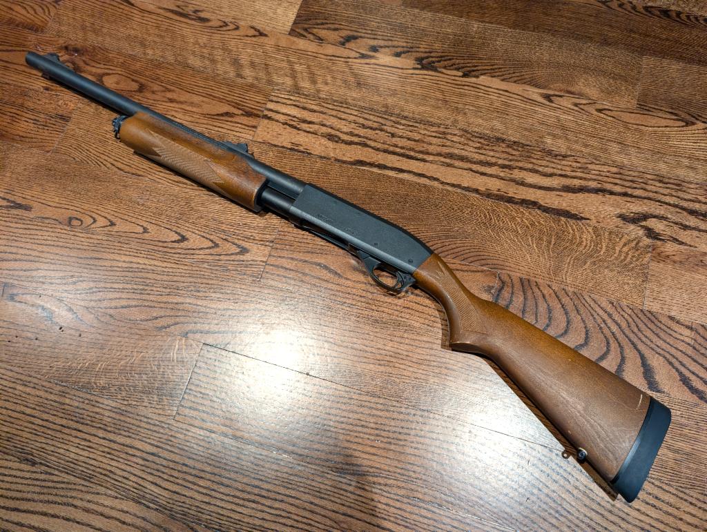 Good condition shotgun. 20" barrel with iron sights and smooth bore, wood furniture, metal trigger pack, sling mounts.