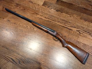 Very good condition side-by-side shotgun, probably refinished. Bluing is very good, wood stock has nice shiny finish, 28" barrels, rubber buttpad, front bead sight.