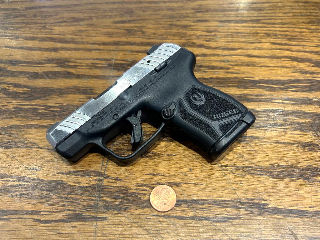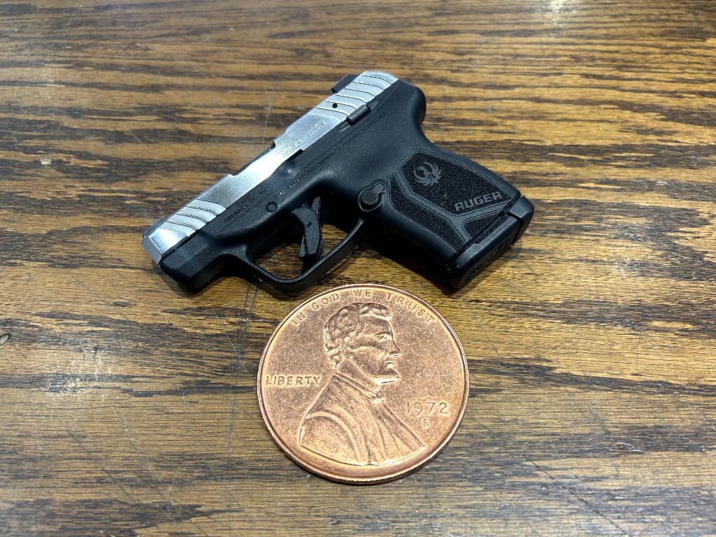 USED in Excellent Condition Ruger LCP MAX Double Action Only Semi-automatic Polymer Frame Pistol in 380ACP with 2.75" Barrel, Matte Stainless Finish with Polished Sides, Black Frame, Tritium Front Sight with White Outline and Drift Adjustable Rear Sight. Original Box with Magazine Loader and 2 Mags (1-10RD, 1-12RD)