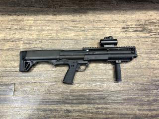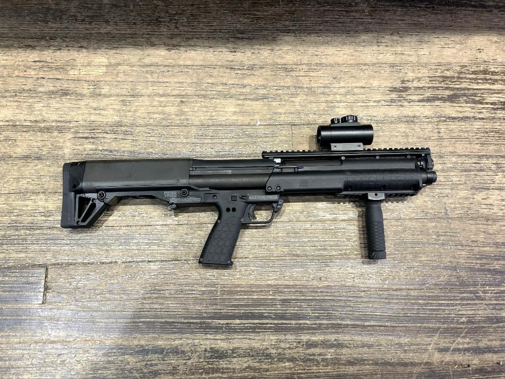 USED in Excellent Condition Kel-Tec KSG Pump Action Shotgun in 12 Gauge with 3" Chamber and 18.5" Barrel. Black Finish, Synthetic Stock, Tactical Handguard with Rails, 7+7 Rounds. Red Dot