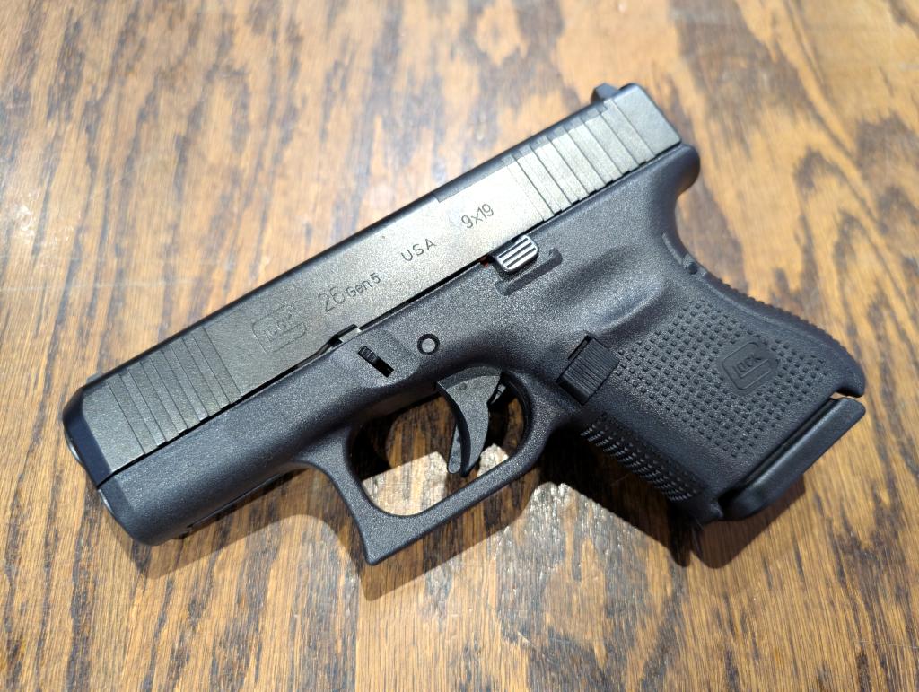 Like new in original box. GLOCK, 26 Gen 5, Striker Fired, Semi-automatic, Polymer Frame Pistol, Sub-Compact, 9MM, 3.43" Barrel, Glock Marksman Barrel, nDLC Finish, Black, No Finger Grooves, Fixed Sights, Ambidextrous Slide Stop Lever, Front Serrations, 10 Rounds, 2 Magazines, MOS