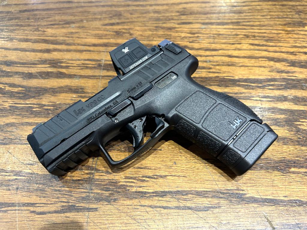 Heckler & Koch, VP9CC, Semi-automatic, Striker Fired, Micro-Compact, 9MM, 3.13" Barrel, DLC Finish, Black, Tritium Front Sight, Black Rear Sight, Vortex Defender CCW Red Dot, (1)-12 Round and (1)-10 Round Magazine