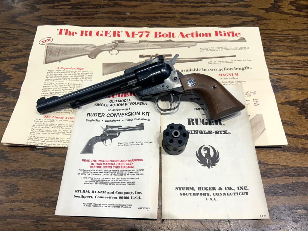 USED in Excellent Condition Ruger Super Single Six Single Action Convertible Revolver in 22 Cal with 5.5" Barrel. 1972 Production per SN. 3 screw model converted with transfer bar. Include Original Trigger Group Parts, Original Box and Paperwork, and 2 Cylinder (22LR installed, 22WMR in box)