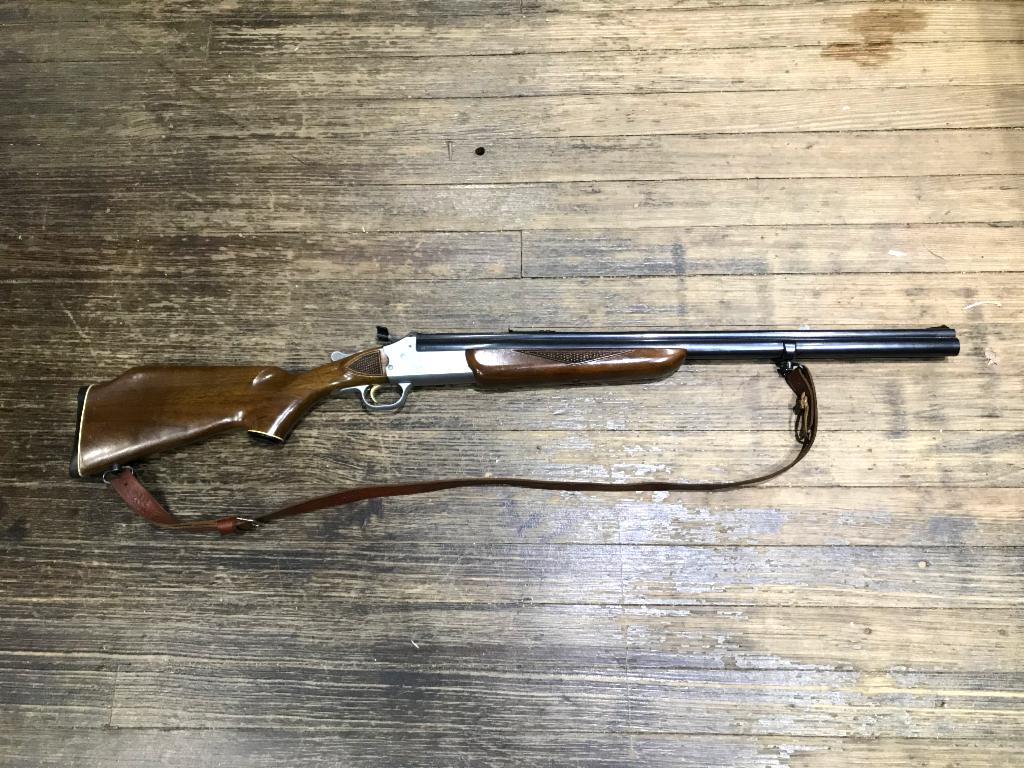 Good condition break-action rifle. 22 mag over 20 gauge. Matte stainless receiver, blued barrels, wood furniture. Good bluing, finish shows wear in some areas, bores are good. Wood is in good shape, finish has some scratches. Buttplate in good shape. Iron sights. Sling.