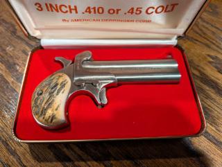 Like new in original box. Stainless finish, 4" barrel, two shots, single-action, 45 Colt or 410 shotshell. Horn grips.