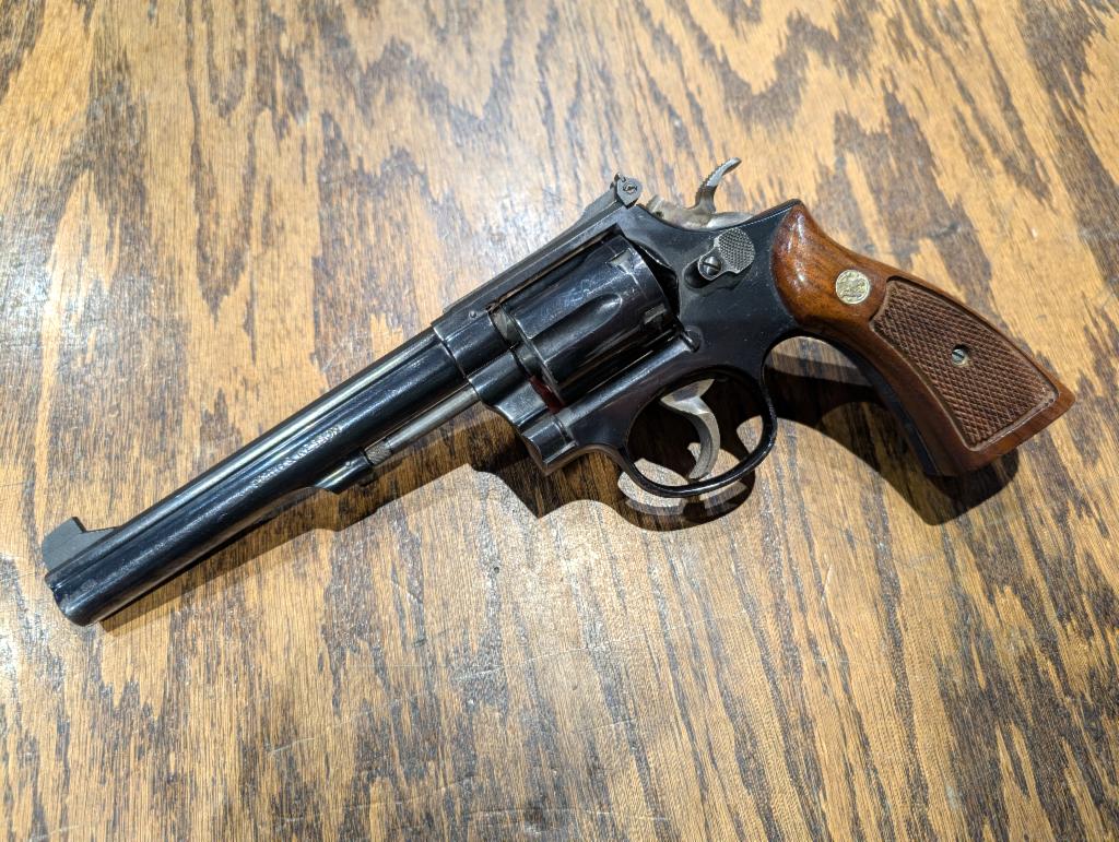 Good condition revolver. Blued finish, 6-round cylinder, 6" barrel, wood grips, very rare single-action only from the factory. Adjustable rear sights. Good rifling. Finish shows wear from age and use, probably 80% or better. No rust, but a couple of chips or blems on side of frame.