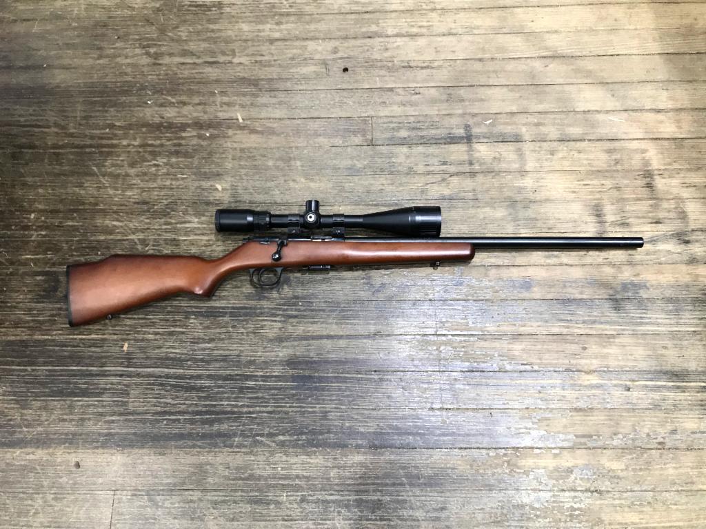 22" heavy barrel, blued finish with minor freckling, good condition wood stock, one magazine, barska scope.