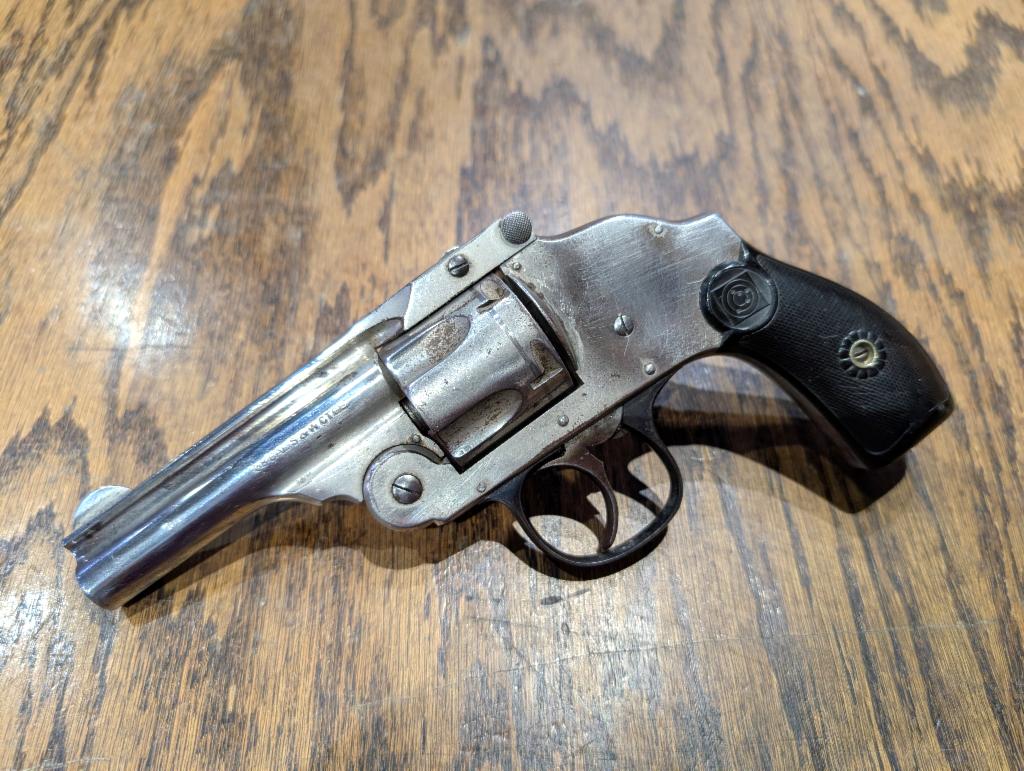 Fair condition top-break revolver. Opens, ejects, trigger can be pulled, cylinder rotates, hammer fires, firing pin works. Finish is probably 50-60%, polished stainless or nickel. Grips are intact with one tiny chip on the right side. Sold as-is, no refunds or returns, have a qualified gunsmith verify safety before firing.