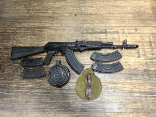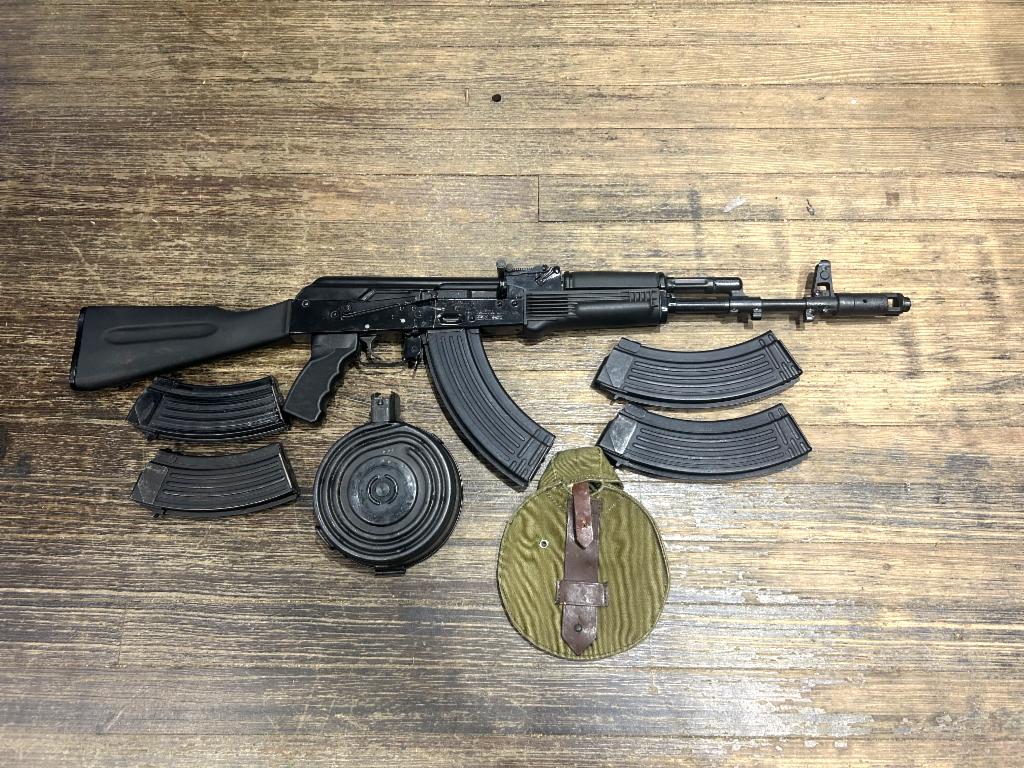 USED in Excellent Condition Russian Produced Saiga AK style Semi-Automatic Rifle made in Izhmash Factory in 2006. UNsporterized to AK-103 Spec in 7.63x39 with 16" Barrel. Features RPK windage adjustable rear sight leaf, Bayonet Lug, AK-74 style 24x1RH thread Front Sight Block with 74 Style muzzle brake. Comes with 6 Mags (3-30RD, 2-20RD, 1-75RD Drum)
