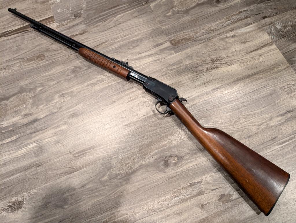 Excellent condition pump-action rimfire rifle. Based on the classic Winchester 62. Blued/black finish, wood furniture, tube fed, adjustable rear sight, hammer fired.