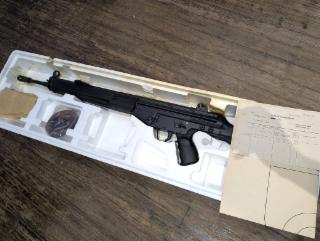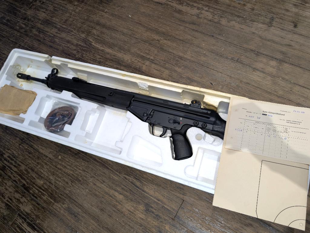Like new in original box. HK date code (1979). Includes shipping box with Braverman address, indicating that this gun was originally sold locally. Styrofoam insert also present in good condition. Gun is exceptionally clean and appears to have only been fired at the factory. Includes factory test target, sling, one magazine.
