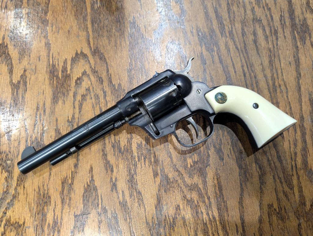 Good condition rimfire pistol. 9-round swing-out cylinder, white plastic grips, blued finish, 5.5" barrel, iron sights, single action only.