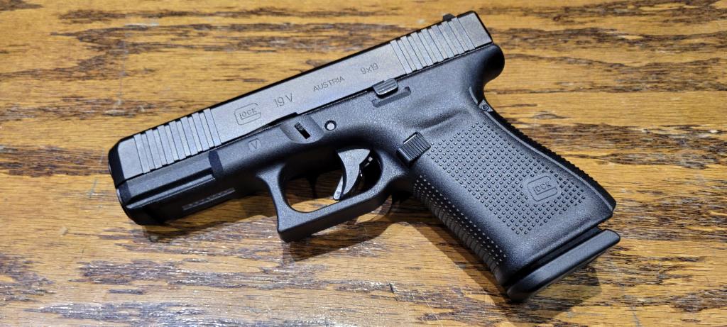 GLOCK, 19V, V Series, Striker Fired, Semi-automatic, Polymer Frame Pistol, Full Size, 9MM, 4.02" Marksman Barrel, nDLC Finish, Fixed Sights, Ambidextrous Slide Stop Lever, Flared Mag Well, No Finger Grooves,Front Serrations 15 Rounds, 3 Magazines