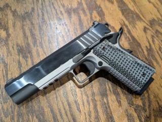 Good condition 1911. Includes soft case. Blued slide, stainless frame, accessory rail, textured grips. Finish is 96% with a couple of light scratches from use.