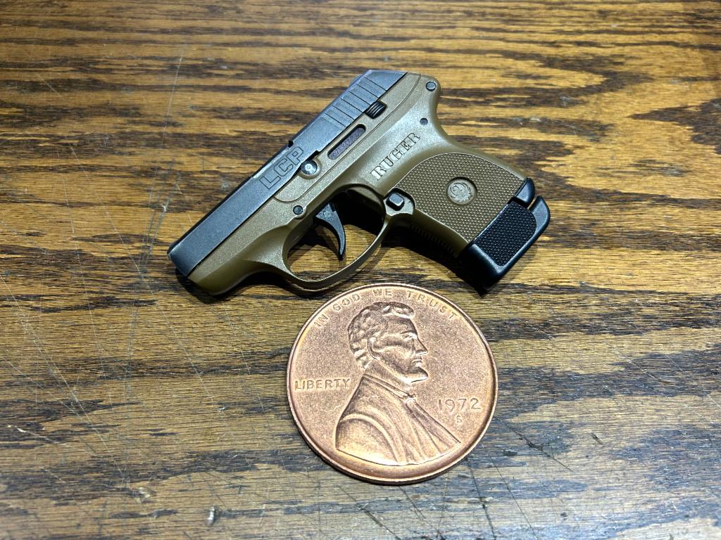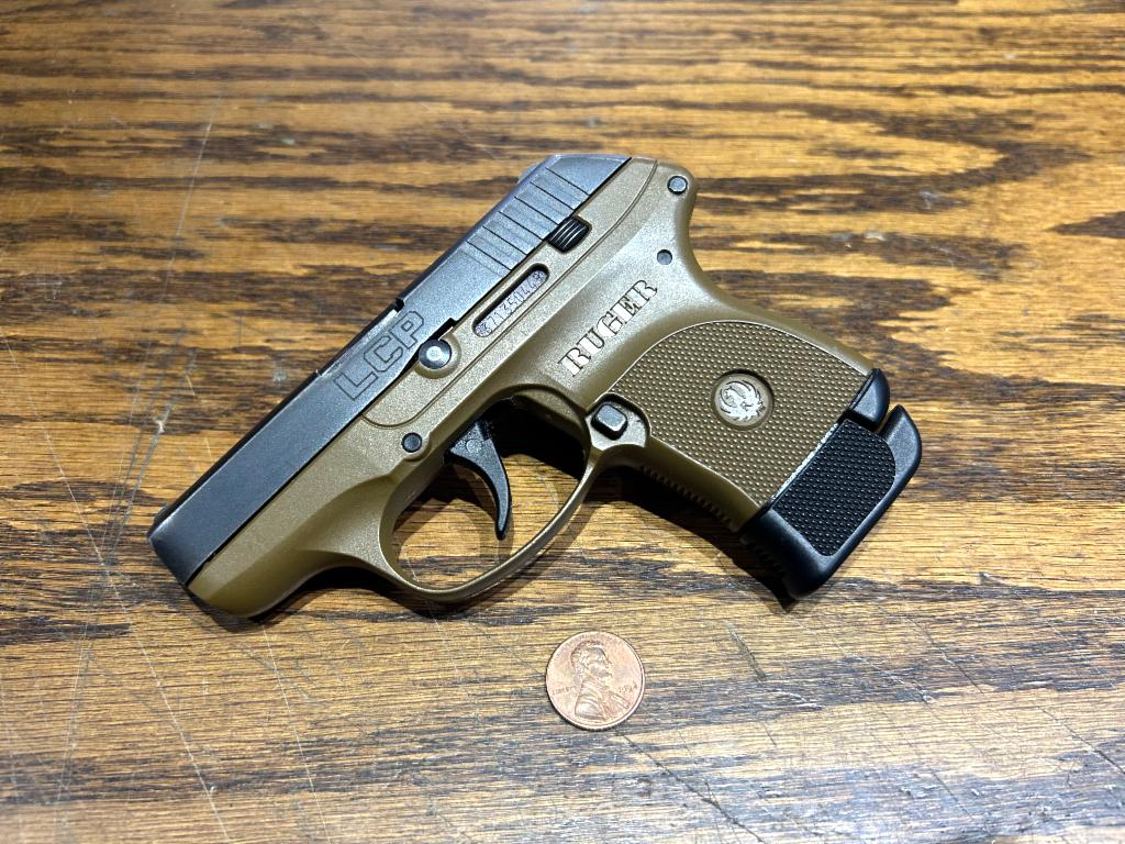 USED in Good Condition Ruger LCP Single Action Only Sub-Compact Semi-automatic Polymer Frame Pistol in 380 ACP with 2.75" Barrel. Black Oxide Finish, FDE Frame, Integral Fixed Sights. Pocket Holster. 2 Mags (1-6Rd, 1-7Rd)