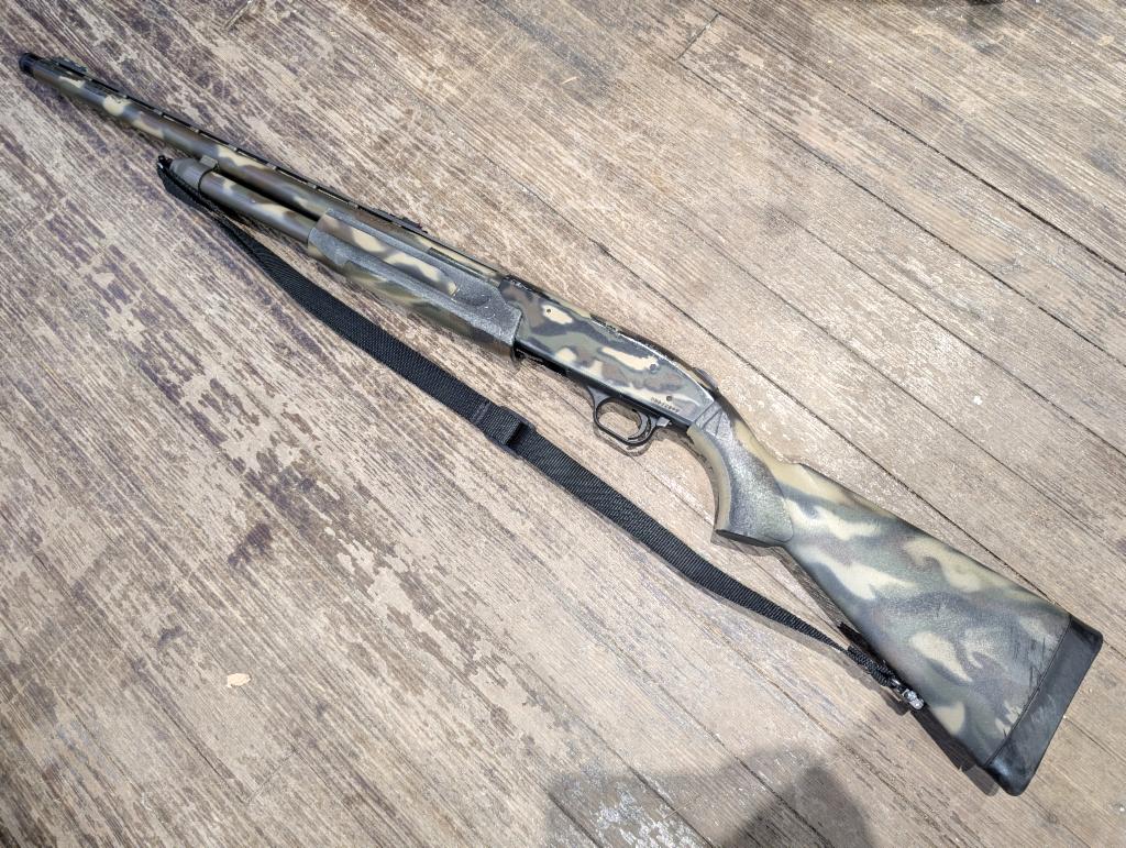 Good condition pump-action shotgun. Worn camo finish, 24" ported vent-rib barrel, fiber optic sights, choke installed, sling. Receiver and finish show wear from use and age.