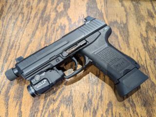 Excellent condition semi-auto handgun. Compact version of the HK45, threaded barrel with thread protector, two 10-round mags, soft case, Streamlight TLR7 weapon light.