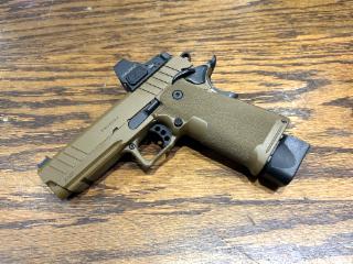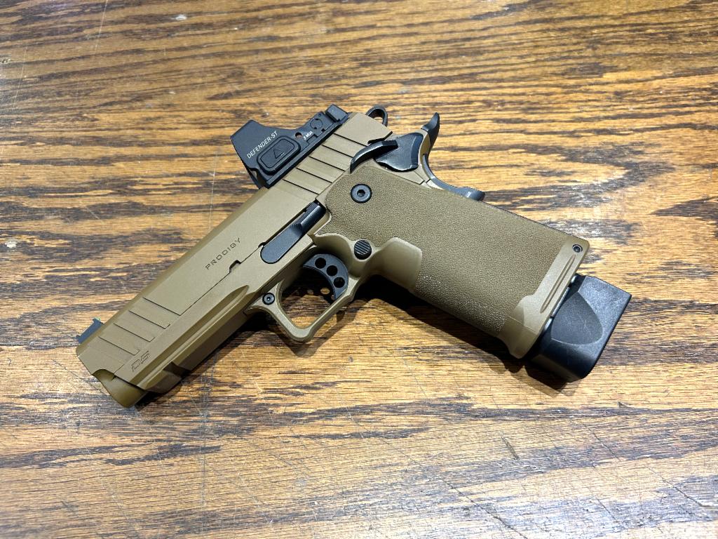 Used in Excellent Condition Springfield Prodigy DS Semi-automatic Steel Frame Pistol in 9MM with 4.25" Forged Bull Barrel. Coyote Brown, Polymer Grips, Fiber Optic Front, Black Serrated Rear Sights, Optics Ready with Vortex Defender, Ambi Safety. Original Box w/ 2-20RD Mags