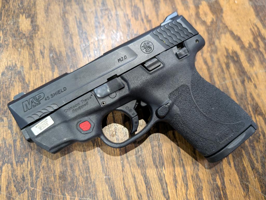Excellent condition in original box. Compact pistol, good choice for concealed carry. Black finish, 3" barrel, manual safety, integral Crimson Trace laser (tested working). Includes one mag and holster.