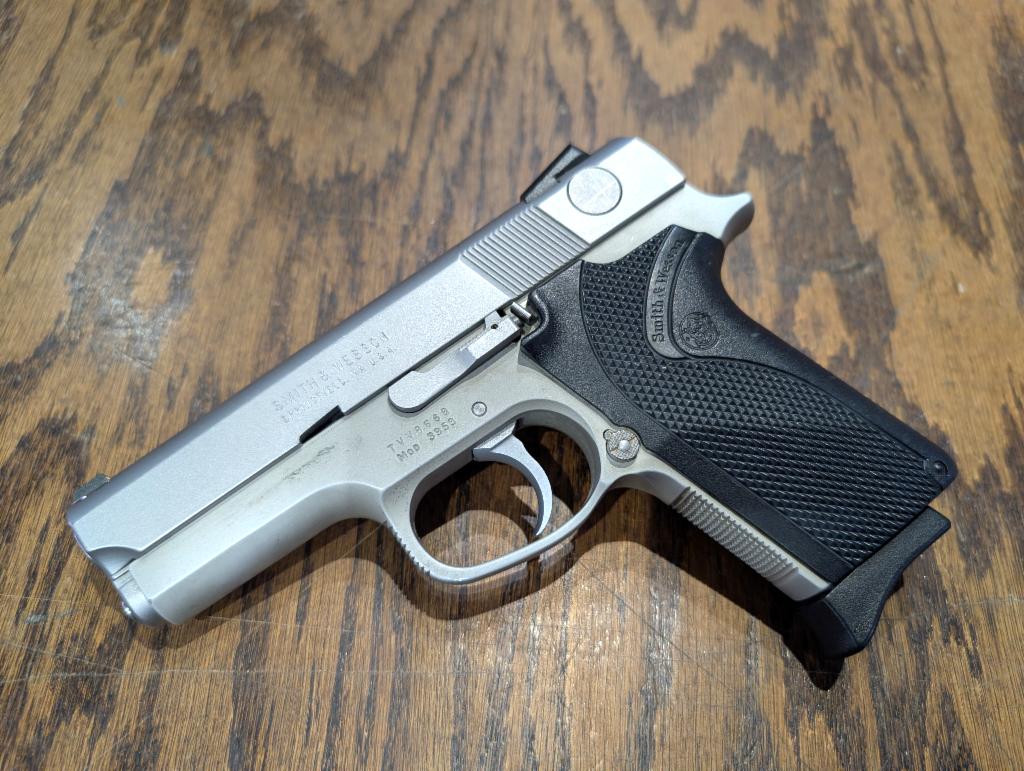Good condition semi-auto handgun. Metal frame, stainless finish, black plastic grips, iron sights, two mags, double-action only. Finish has some minor blemishes from use and age. 3-8Rd Mags