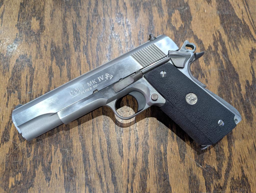USED in Excellent Condition Colt KM IV Series 80 Government Model Full Size Steel Frame Semi-Automatic 1911 Pistol in .45 Auto with 5" Barrel. Stainless. Comes iwth 1 mag. 1994 Year of Production per Colt SN Lookup database.